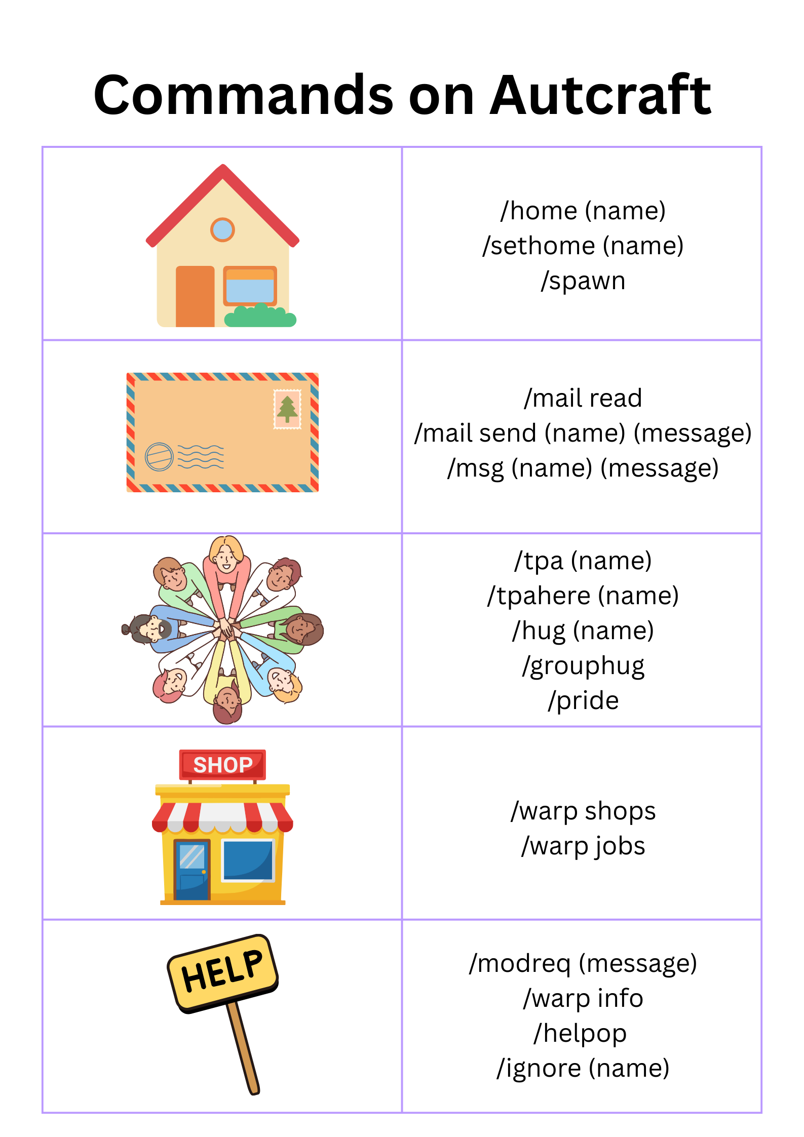 For our new families! Here's our most important commands, on a picture that you can print out for our younger players who are still learning how our commands work on Autcraft. Hope this is helpful!