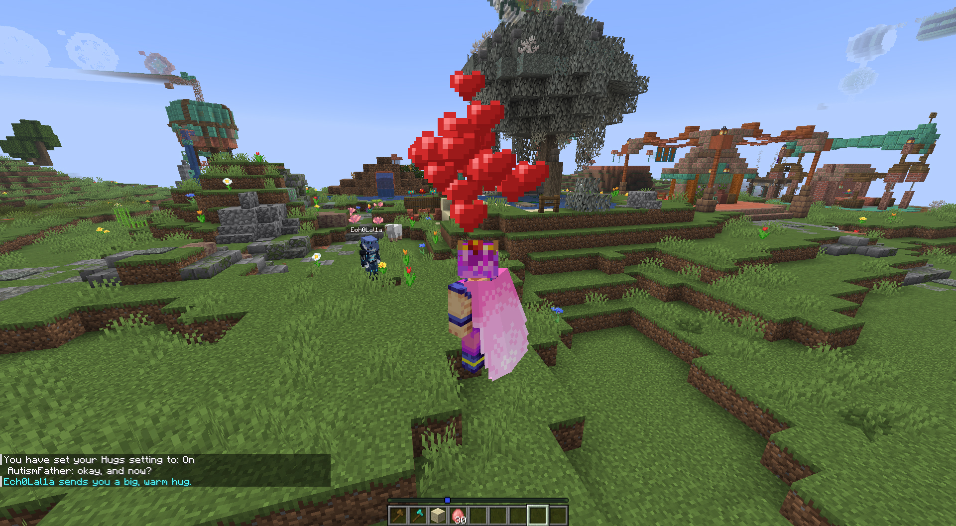 Starting today, when one player hugs another, both players will see hearts appear over their heads for approximately 5 seconds. This helps to give a visual indicator so that you can more easily find each other but also to help reaffirm the action. Only the 2 players involved in the hug will see the hearts, all other players do not.