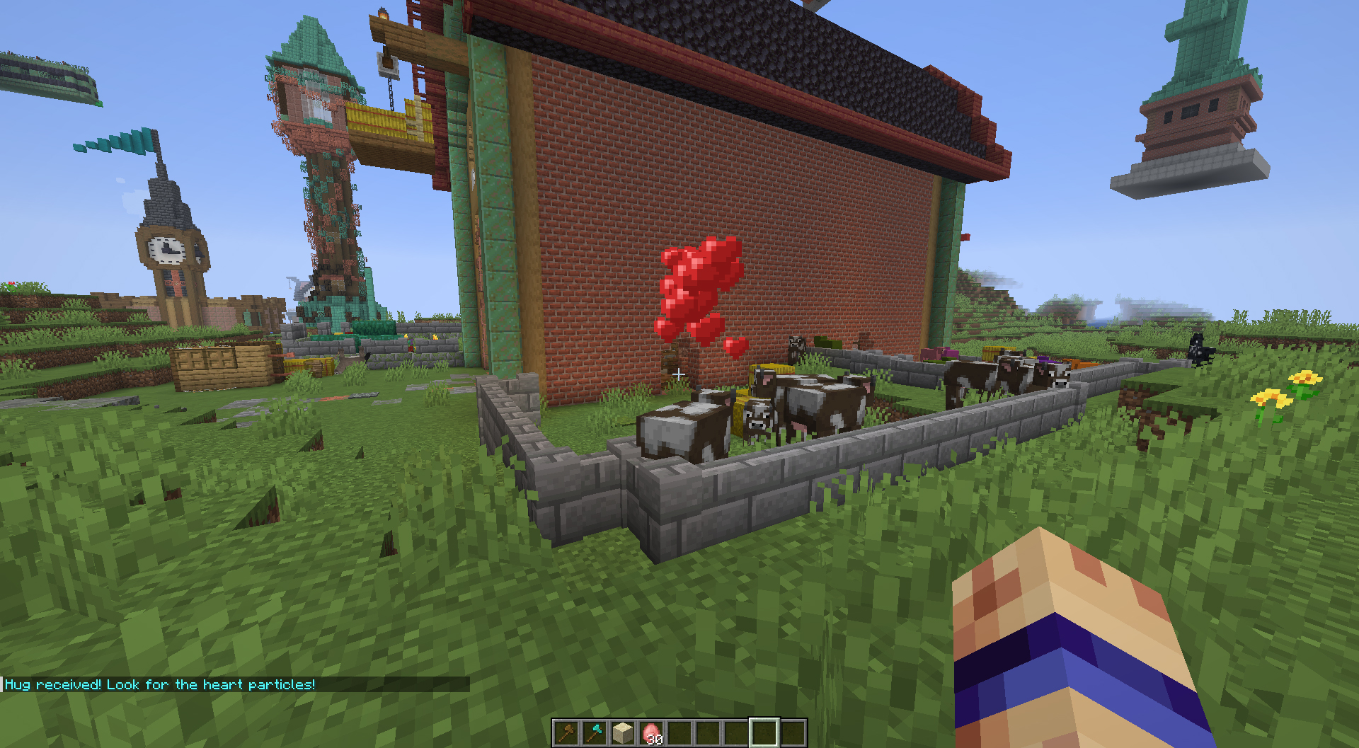 Now you can do /hug cow, and the closest cow to you, within range, will display hearts above it. This works with pig, chicken, wolf, cat... even creeper, zombie... just make sure you spell the name of the entity correctly, for example: /hug armor_stand